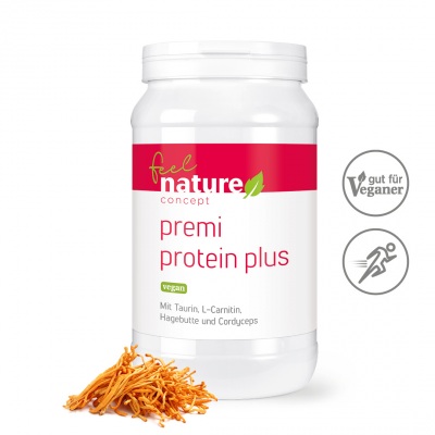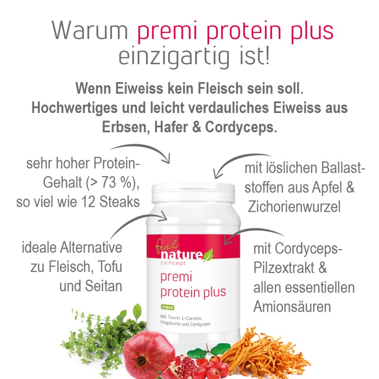 Mit seinen Protein-Konzentraten aus Erbsen und Hafer sowie dem Vitalpilz Cordyceps sinensis vereint premi protein plus gleich drei hochwertige Eiweissquellen – und alle essentiellen Aminosäuren. Neben dem für Veganer besonders wichtigen Lysin bietet premi protein plus jede Menge L-Glutamin und eine Extraportion L-Glycin. Ein weiterer Pluspunkt: Ähnlich wie Erbsen enthält das Erbsenproteinkonzentrat reichlich Eiweiss, aber im Verhältnis weniger unerwünschte „Antinährstoffe“ wie Phytate und Lektine, die die Verdauung stören.