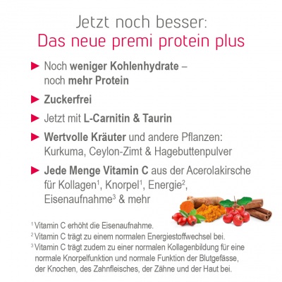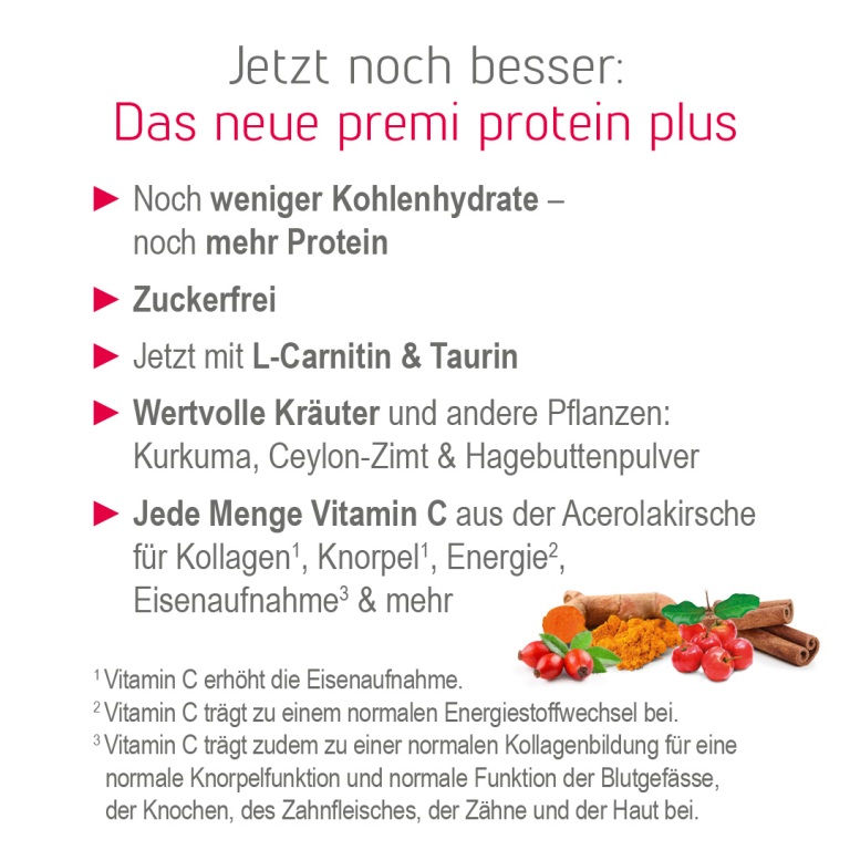 Dank Vitamin C aus der Acerolakirsche unterstützt premi protein plus zusätzlich Immunsystem3 und Kollagenbildung5, verleiht dem Stoffwechsel frische Energie1 und fördert sogar die gerade bei pflanzenbasierter Ernährung so wichtige Eisenaufnahme2.